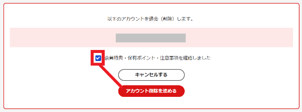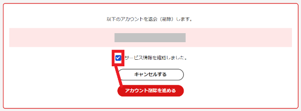 - ステップ6同じようなページが表示されるので、確認欄にチェックを入れ「アカウント削除を進める」のボタンを押します。