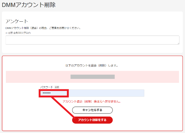 - ステップ7退会理由入力は任意です。パスワードを入力後、「アカウント削除をする」のボタンを押します。