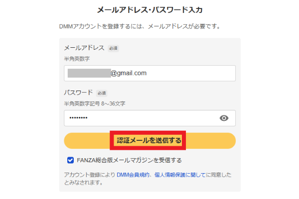 - ステップ3メールアドレスおよび任意のパスワードを入力し、「認証メールを送信する」のボタンを押します。