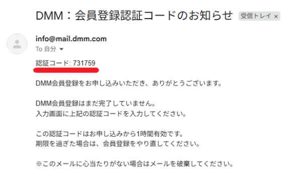 - ステップ4受信したメール(info@mail.dmm.com)の認証コードを確認します。