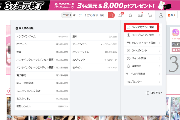 - ステップ1ログイン状態で画面右上の「DMMアカウント情報」へ進みます。