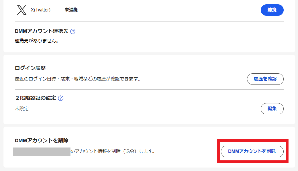 - ステップ3下部にある「DMMアカウントを削除」のボタンを押します。